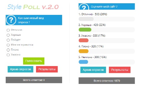 | Новый цветной вид опроса второй версий включает в себя графический стиль с заменой цвета. не чего удивительного и нового почти нет, просто иное оформление и вывод в блок вашего сайта. У данного вида опроса, ширина полосы ответа нормальной длины. Установка: Скачиваем архив в котором все стили и картинки Код <div class="pollBlock"> <div class="pollTitle">$QUESTION$ ?</div> <div class="pollAns">$ANSWERS$</div> <div align="center"> <button class="button_poll bleumarin" type="submit" href="$ARCHIVE_LINK$"><span>Архив опросов</span></button> <button class="button_poll orange" type="submit" href="$RESULTS_LINK$"><span>Результаты</span></button> </div> <script src="http://activiks.ru/img/png.js" type="text/javascript"></script> <div class="pollTot">Всего ответов: <b>$TOTAL_VOTES$</b></div> </div> <link type="text/css" rel="StyleSheet" href="http://bambun.ru/css_js/style_poll.css" /> <script type="text/javascript" src="http://bambun.ru/css_js/poll_js.js"></script> Виды кнопок опроса: ![]() ТАКИМ ОБРАЗОМ ВЫ ПОДБЕРЕТЕ ЦВЕТ ПОД ВАШ ДИЗАЙН. | |