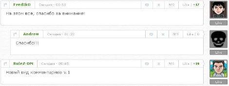 Здравствуйте дорогие читатели, сегодня хочу вас порадовать новым видом комментариев и модер-панель для uCoz, в этом виде комментария присутствует уголок что делает вид комментариев симпатичней, не стандартная модер-панель + кнопка "Ответить", небольшая кнопочка "Like". Код